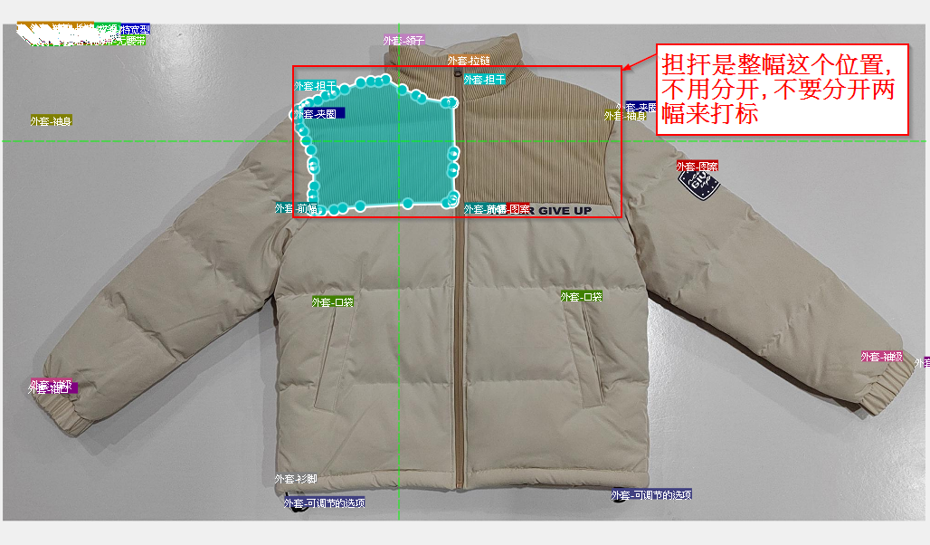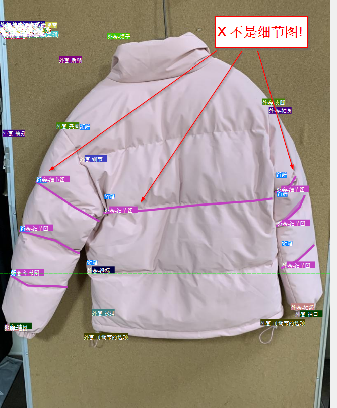 每张图只有一个「前幅」或「后幅」或「细节图」或「侧面」, 是用来识别这张图是拍摄那一面, 有些同学误以为「细节图」是用来标注款式中的细节地方, 在正或反的图中也标注上「细节图」标签